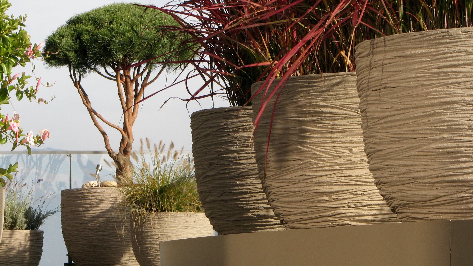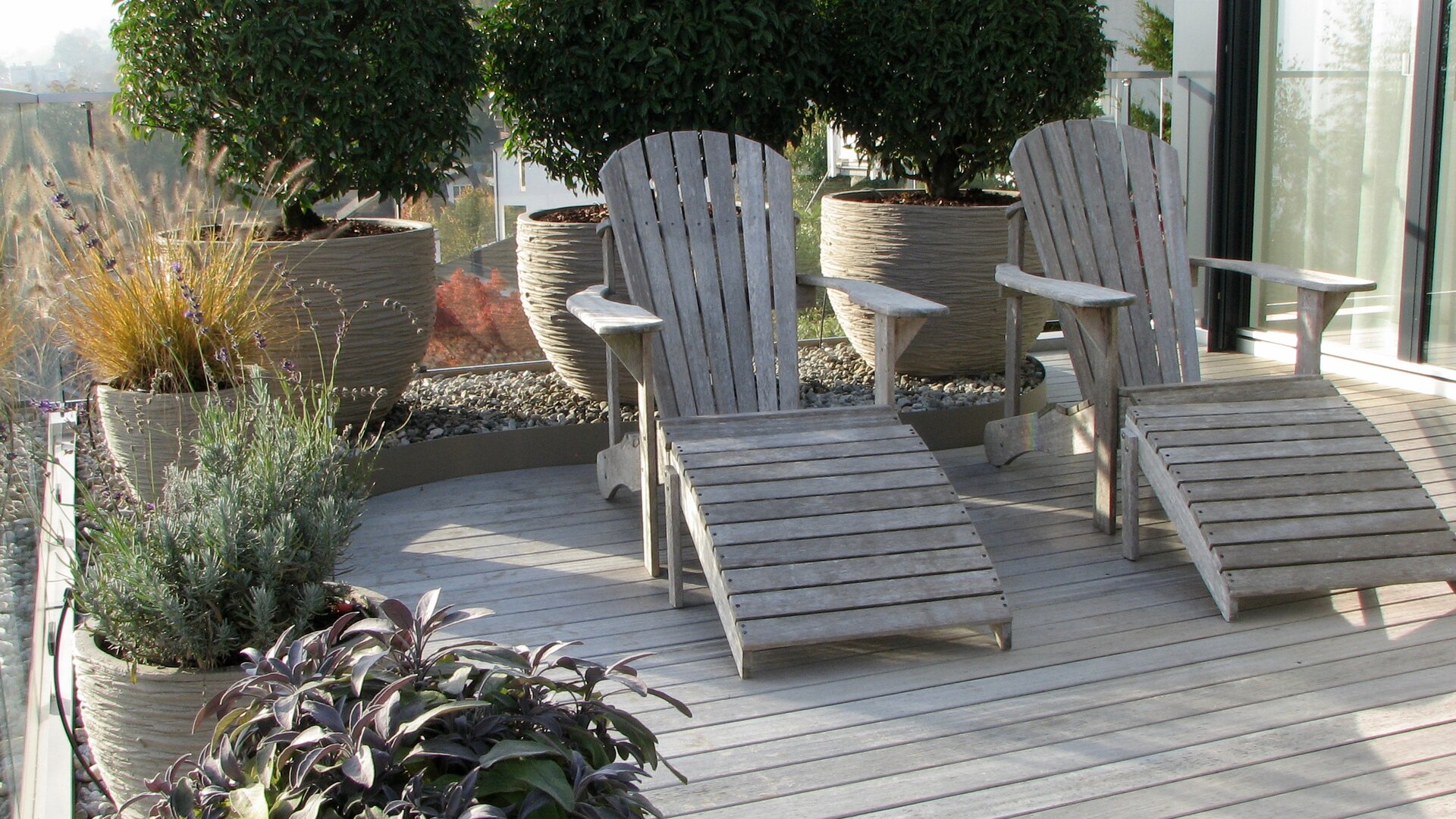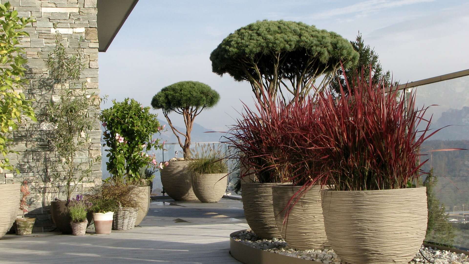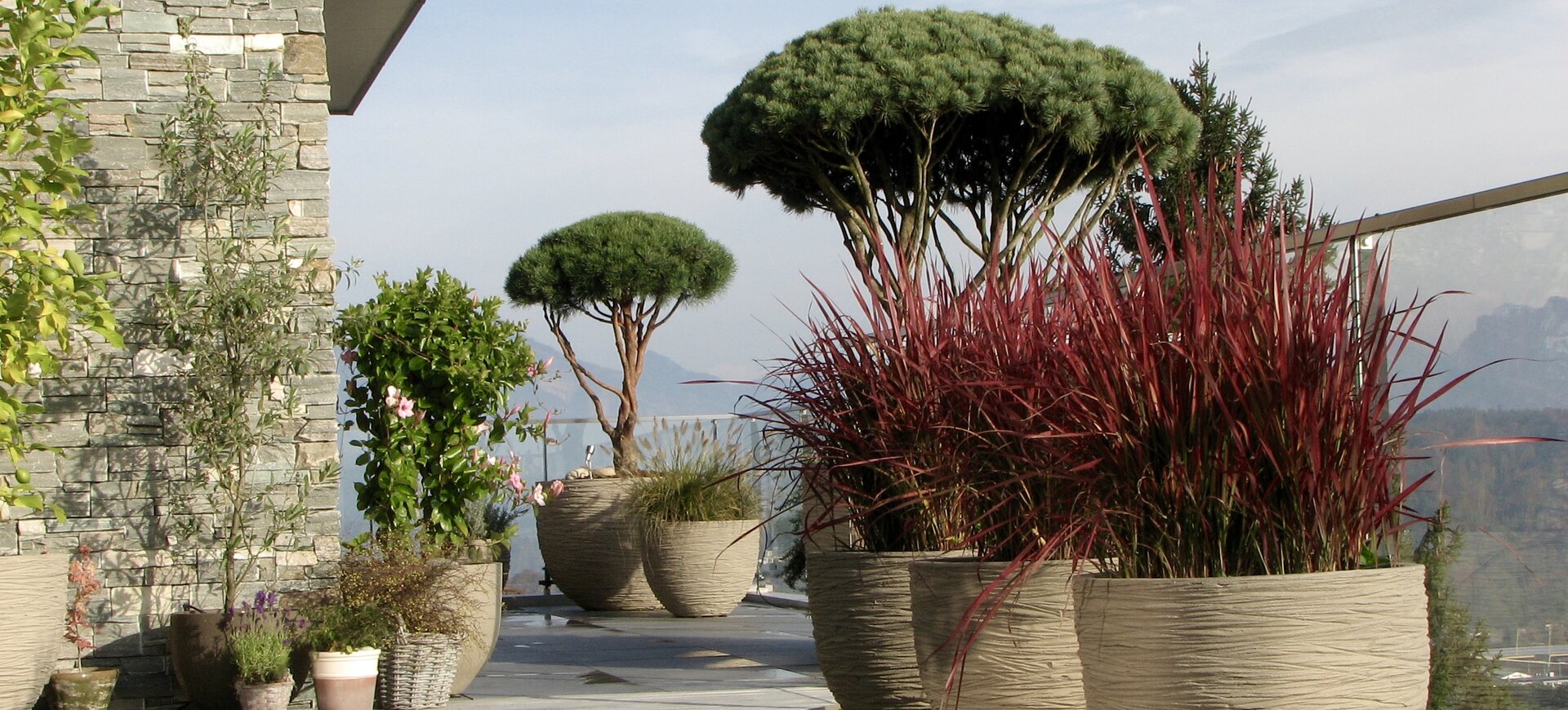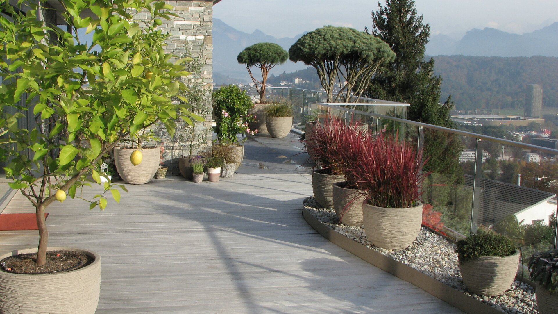 Bei dieser Terrasse wurden die hellen Beläge und Farben des Innenraums bewusst auf die Aussenterrasse erweitert. Immergrüne Formgehölze in hellen Tongefässen bilden das Highlight auf dieser sonnenverwöhnten Terrasse.